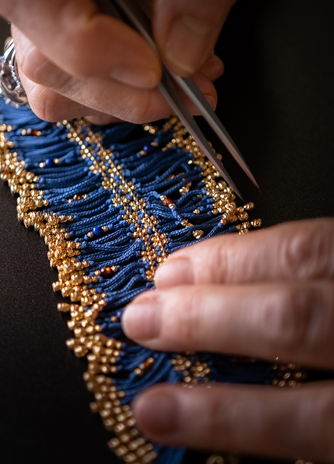 La seta, simbolo di eleganza e artigianato, incontra l’oro, fondendo il passato e il presente in un’opera unica, realizzata interamente a mano.
